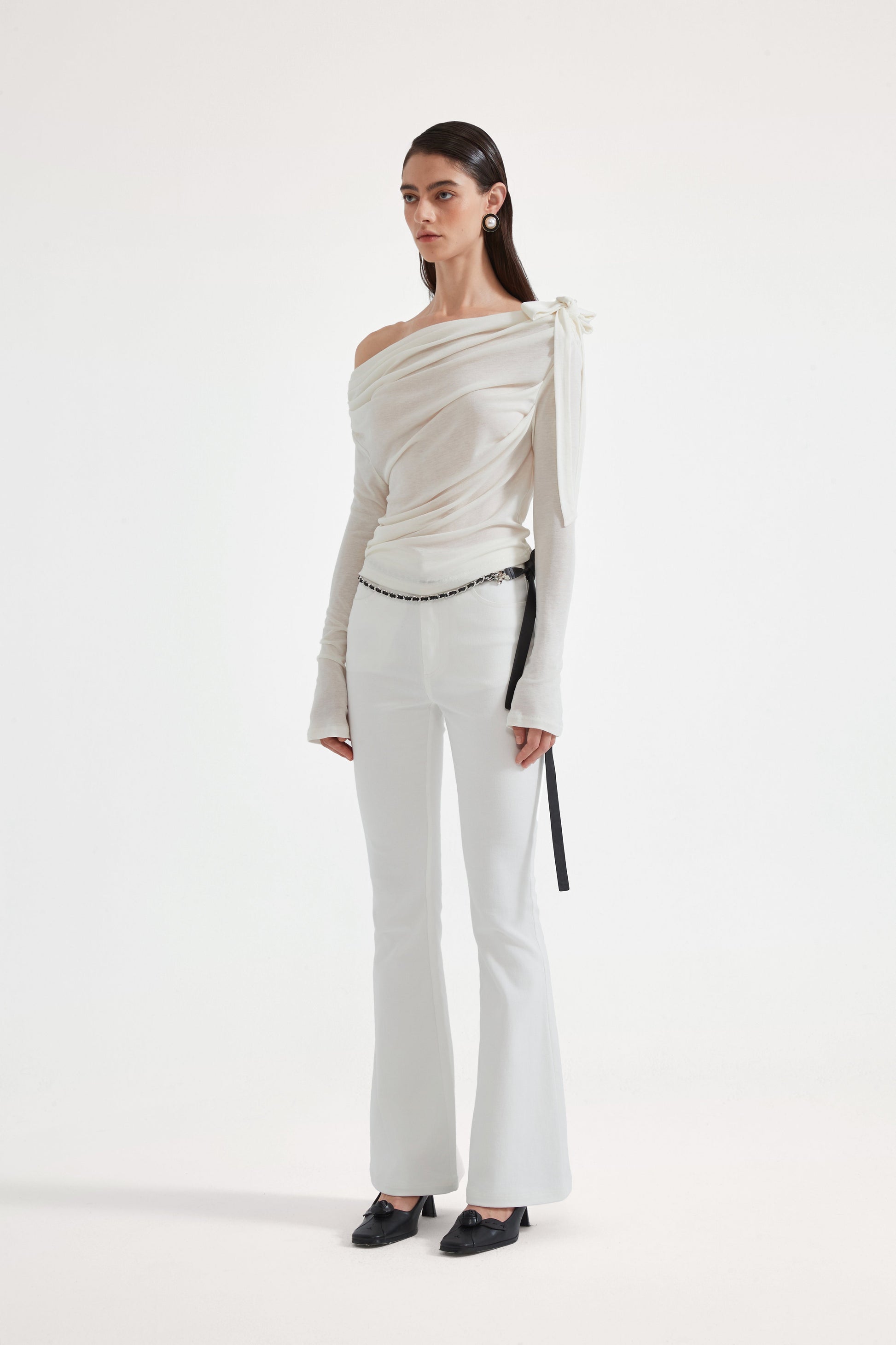 White Off-The-Shoulder Pleated Bow Ribbon Blouse
